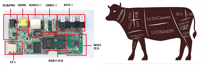 比如左侧这个机顶盒的设计,他的构成方式:他需要链接显示器有HDMI接口或AV接口,需要联网的话,他需要有一个RJ45网口模块或者WIFI模块,需要供电并分配电源,就需要有DCDC电源转换或PMU电源管理单元;他需要存储信息就需要用到DDR、FLASH等存储器模块,它就是有各个功能模块组合而成的。
